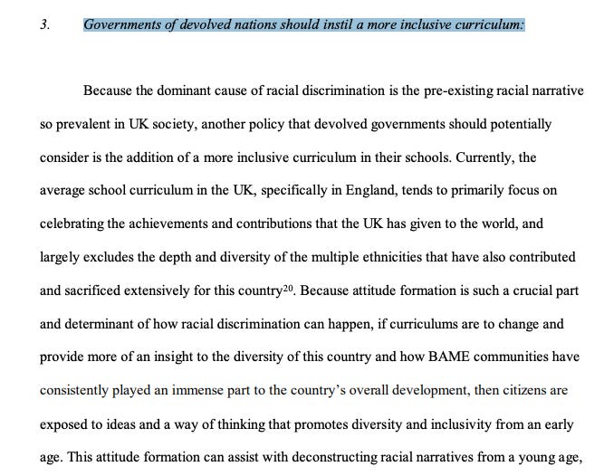 … and that “Governments of devolved nations should instil a more inclusive curriculum” to help with “deconstructing racial narratives from a young age”: