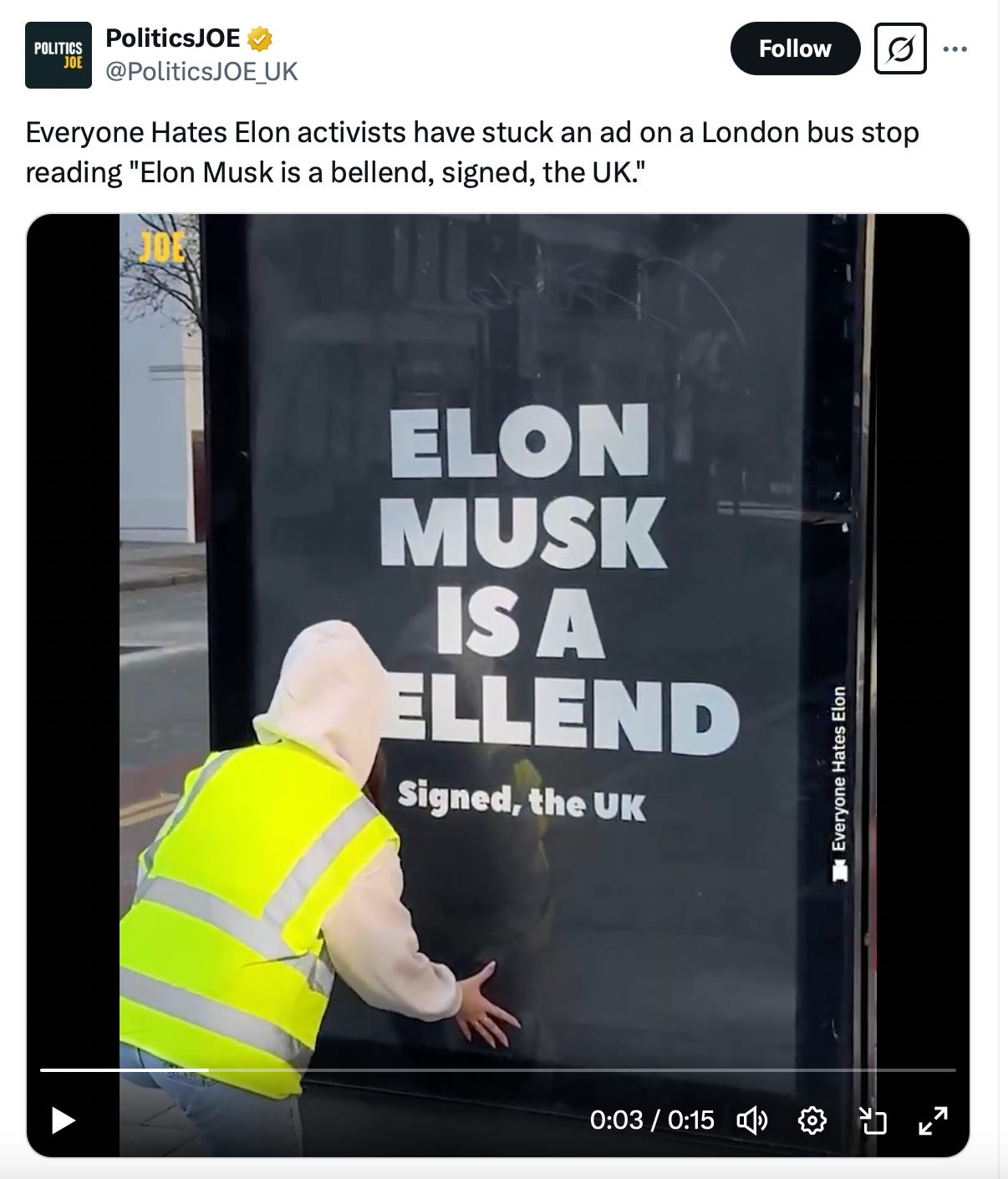 Talking of activist groups, I also love Led by Donkeys’ anti-Musk campaign. The group are real leaders in the “anti-Musk” activist space. Who knows how many more will enter the field!