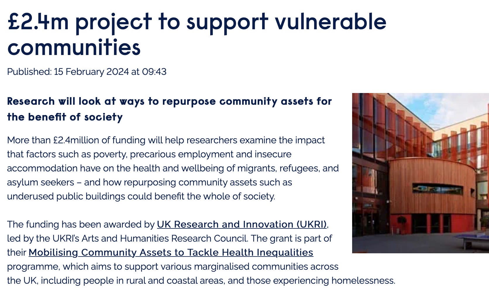 The £2,430,127 project will see researchers from universities, the NHS, local government agencies, charities and community groups work with migrant communities, refugees and asylum seekers to identify new ways to enhance their health and wellbeing through the use of community assets, such as open spaces, advice centres, community hubs and religious organisations.