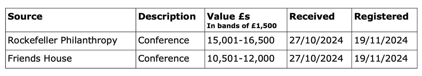 These MPs happen to be part of the All Party-Parliamentary Group on Afrikan Reparations, which receives £10,501-£12,000 from Friends House, as well as £15,001-£16,500 from Rockefeller Philanthropy. It’s all rather mysterious: