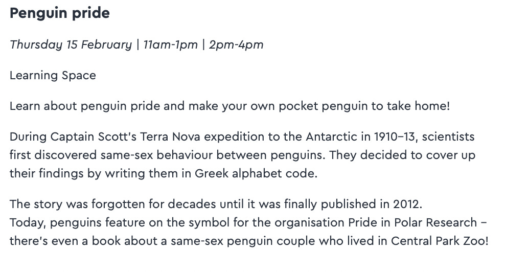 The event (which took place yesterday) allowed participants to “Learn about penguin pride and make your own pocket penguin to take home!”