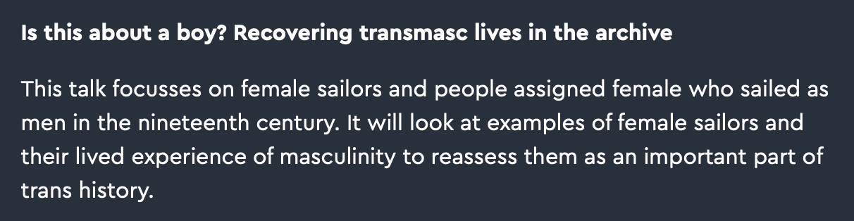 Hosted by Kit Heyam (they/he), “Writer, researcher, heritage practitioner and “trans awareness trainer”.