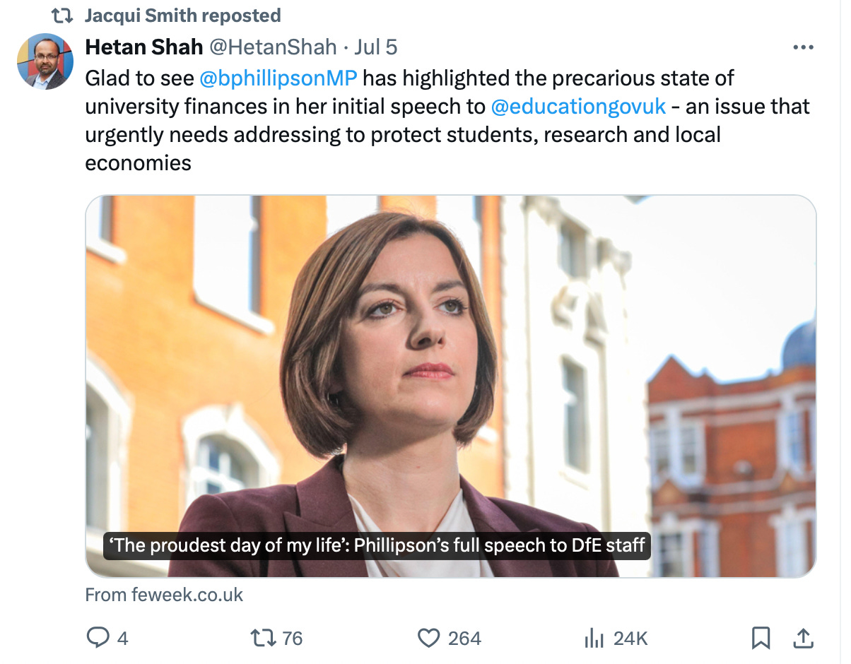 Shah posted that he was glad to see Phillipson highlight “the precarious state of university finances”, an “issue that urgently needs addressing to protect students, research and local economies”.