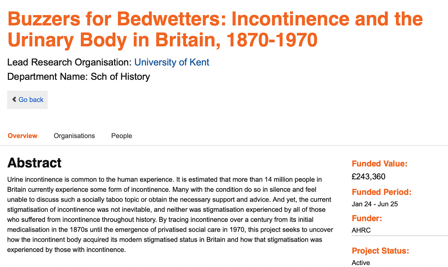 By tracing incontinence over a century from its initial medicalisation in the 1870s until the emergence of privatised social care in 1970, this project seeks to uncover how the incontinent body acquired its modern stigmatised status in Britain and how that stigmatisation was experienced by those with incontinence.