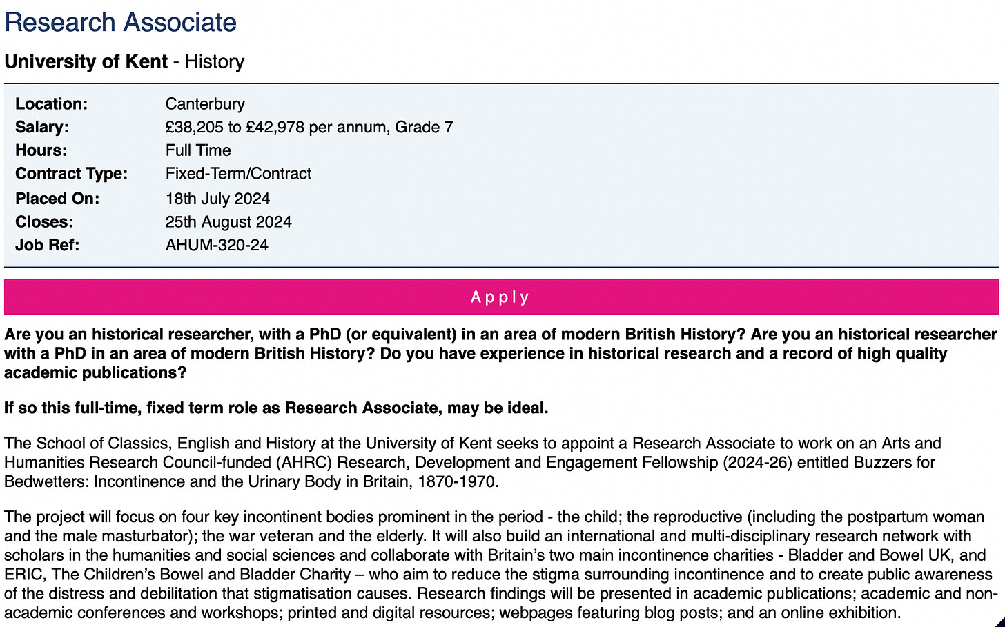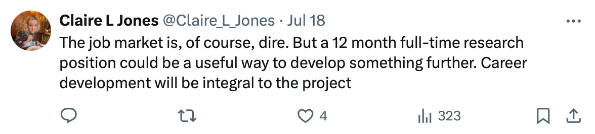 Professor Dr Claire Jones, Senior Lecturer in the History of Medicine, recently posted a link to this job advert, with a salary of £38,205 to £42,978 per annum: