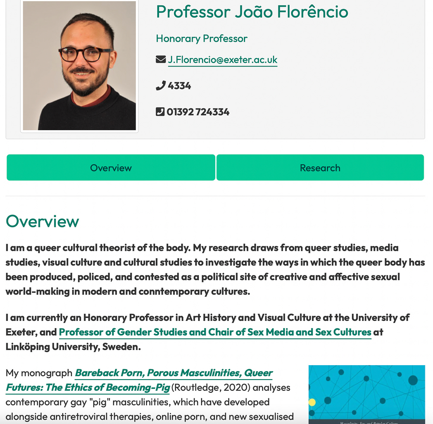 Another great mind on the project is Professor João Florêncio, “a queer cultural theorist of the body” whose “monograph Bareback Porn, Porous Masculinities, Queer Futures: The Ethics of Becoming-Pig (Routledge, 2020) analyses contemporary gay "pig" masculinities, which have developed alongside antiretroviral therapies, online porn, and new sexualised patterns of recreational drug use.”