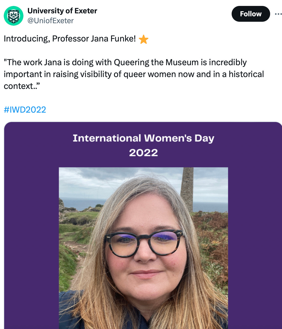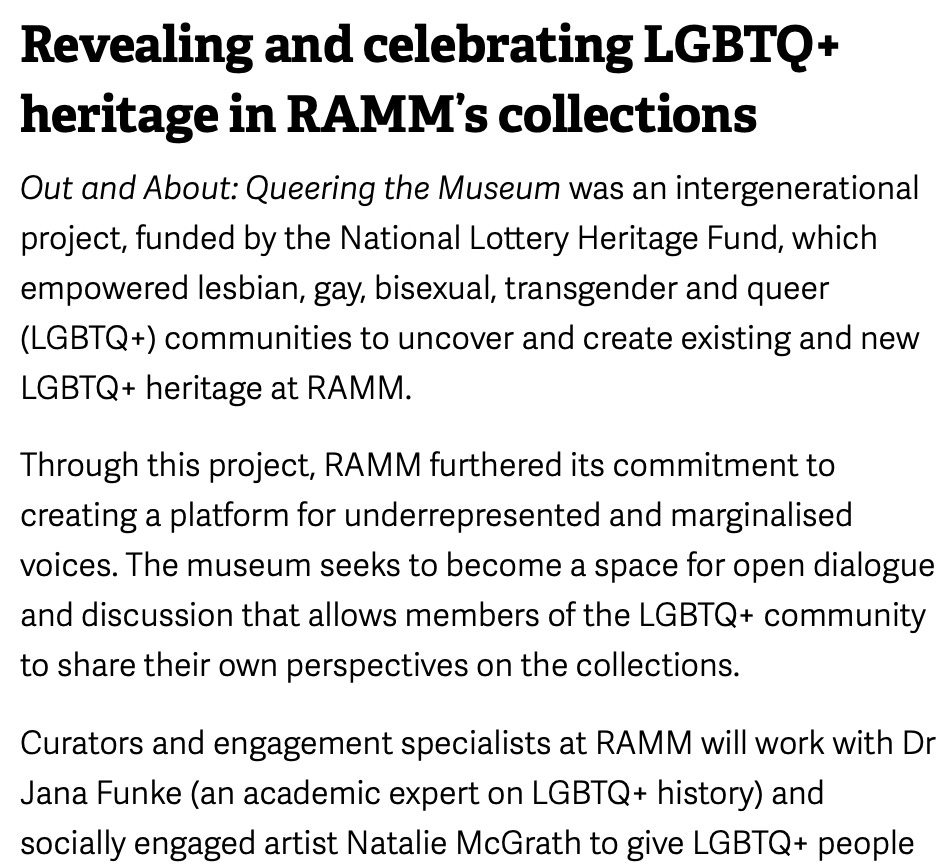 She has previously been awarded a National Lottery Heritage Fund for a project titled "Queering the Museum: Creating, Uncovering and Celebrating LGBTQ+ Heritage at RAMM (Royal Albert Memorial Museum)”, another great use of Brits’ money: