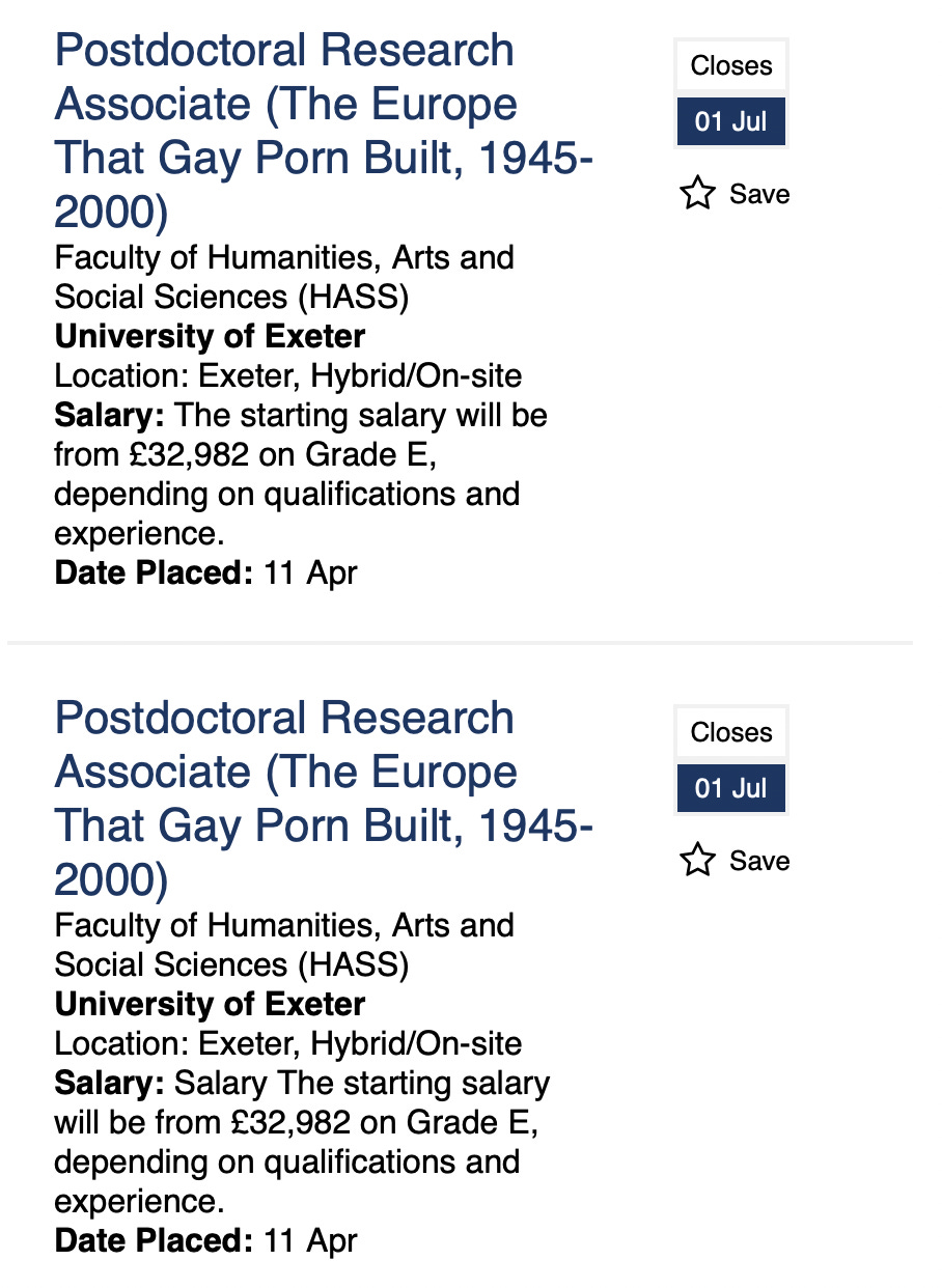 I don’t normally post job adverts on my Substack, but simply couldn’t resist when I saw a fabulous opportunity to research gay porn.