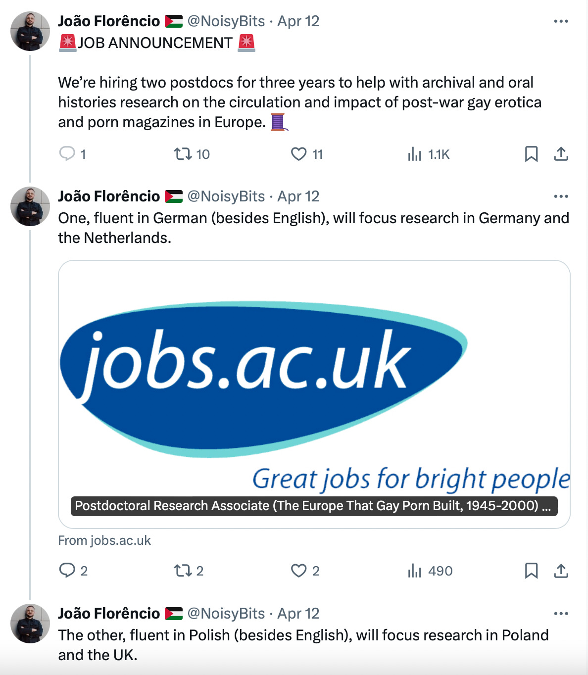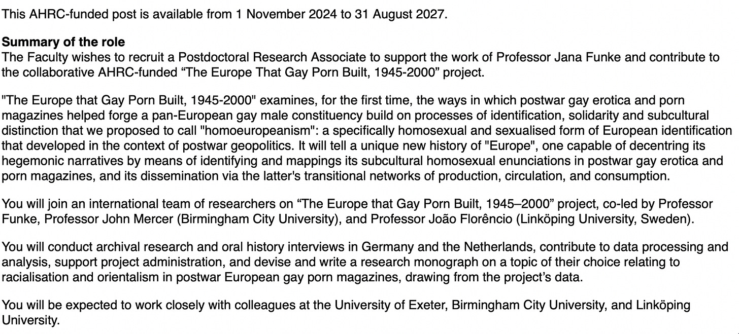 Well now it’s hiring for two posts “to help with archival and oral histories research on the circulation and impact of post-war gay erotica and porn magazines in Europe”… for three years: