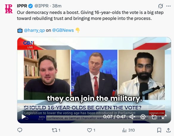 Its Executive Director, Harry Quilter-Pinner, was on GB News arguing in favour of lowering the voting age. You can watch the full clip below or by clicking this link: