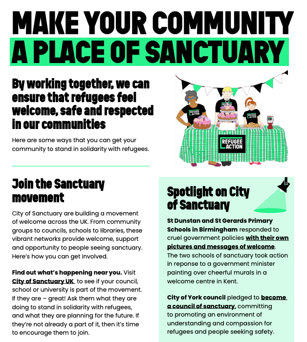 Activists are encouraged to influence their MP, “organise a letter writing event” and make their “community a place of sanctuary” - by working with open-border charity City of Sanctuary UK: