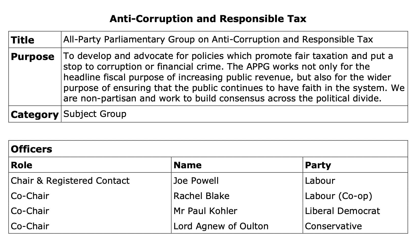 Today I will introduce you to the All-Party Parliamentary Group (APPG) for βAnti-Corruption and Responsible Taxβ.