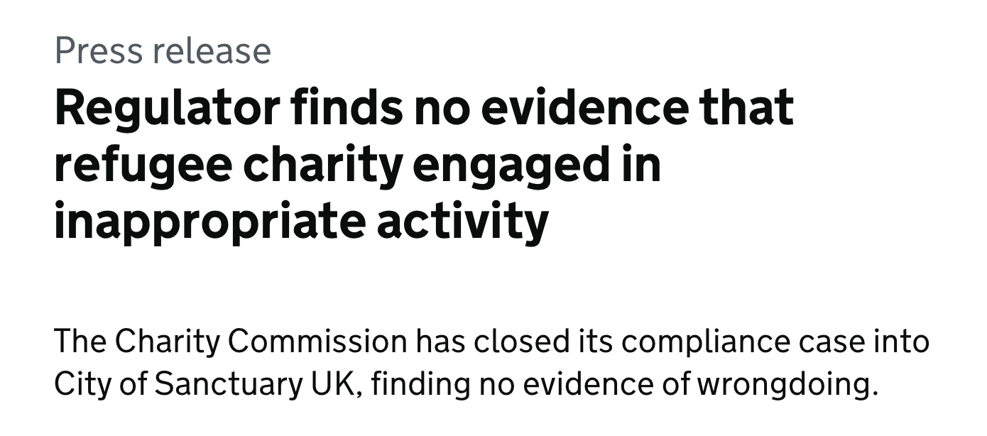 “Regulator finds no evidence that refugee charity engaged in inappropriate activity”, read a press release by the Charity Commission for England and Wales yesterday, after it closed its compliance case into City of Sanctuary UK.