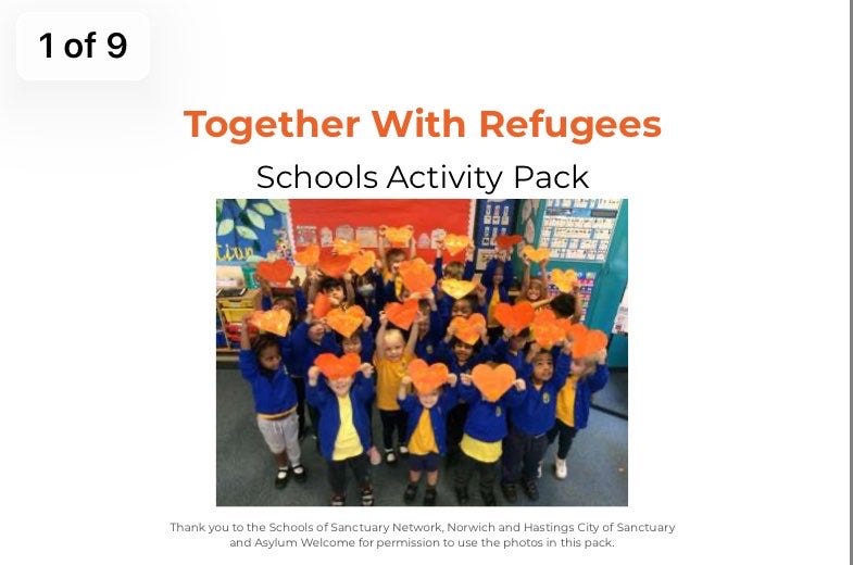 In my article above, for instance, I showed a screenshot of a Schools Activity Pack put together by City of Sanctuary UK (its Schools of Sanctuary Team and Together with Refugees). Here it is: