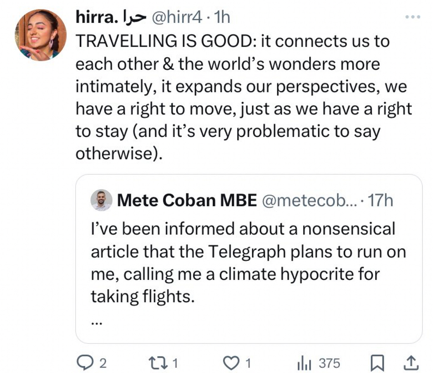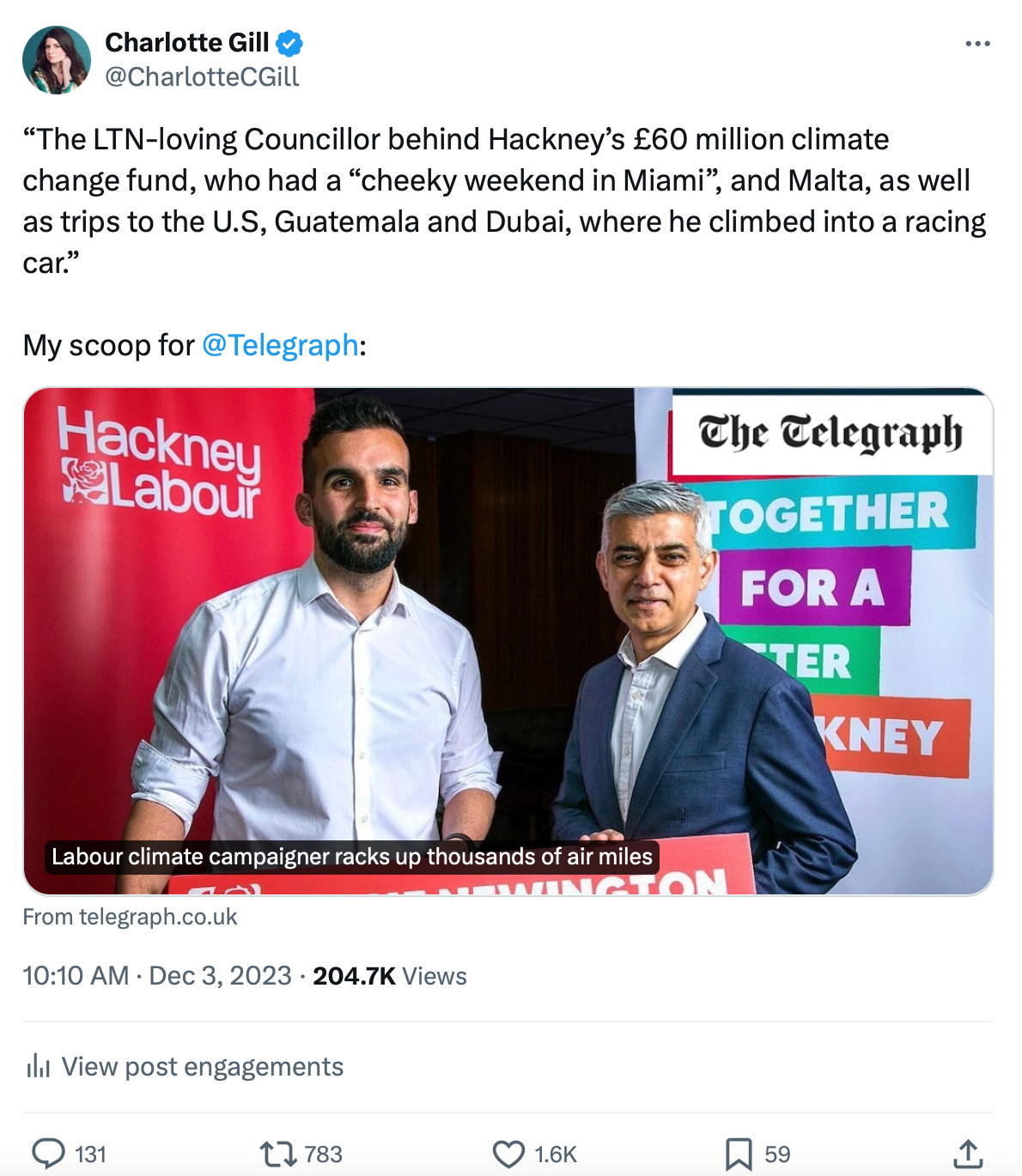 Coban - who I wrote about for The Telegraph last year - is the eco warrior who clocked up around 40,000 air miles on multiple long-haul trips - despite lecturing Hackney residents about LTNs and being the poster boy for the area’s £60 million contribution to climate change.