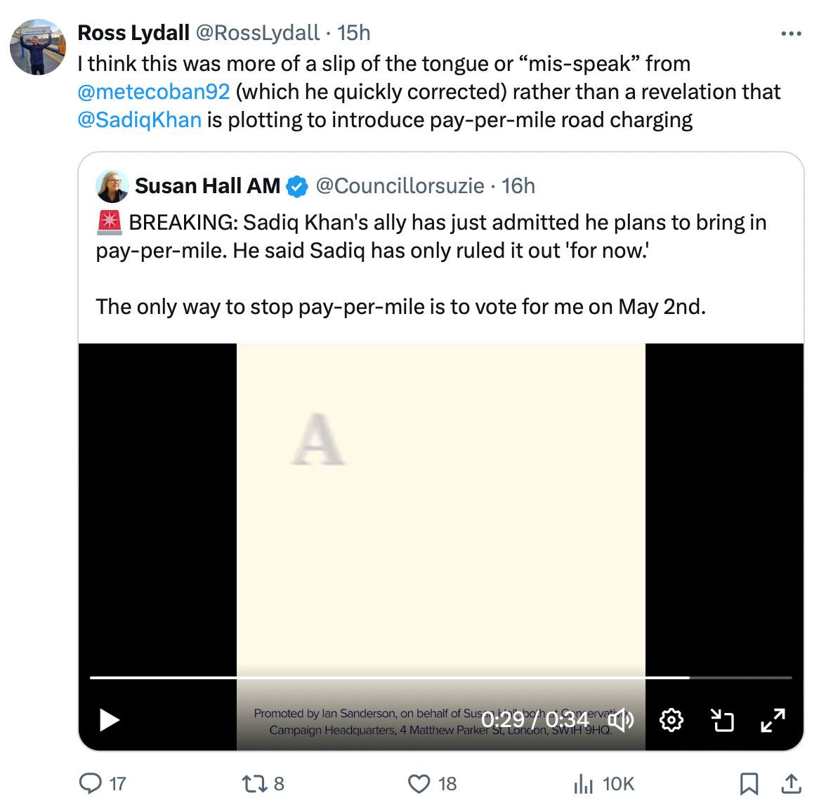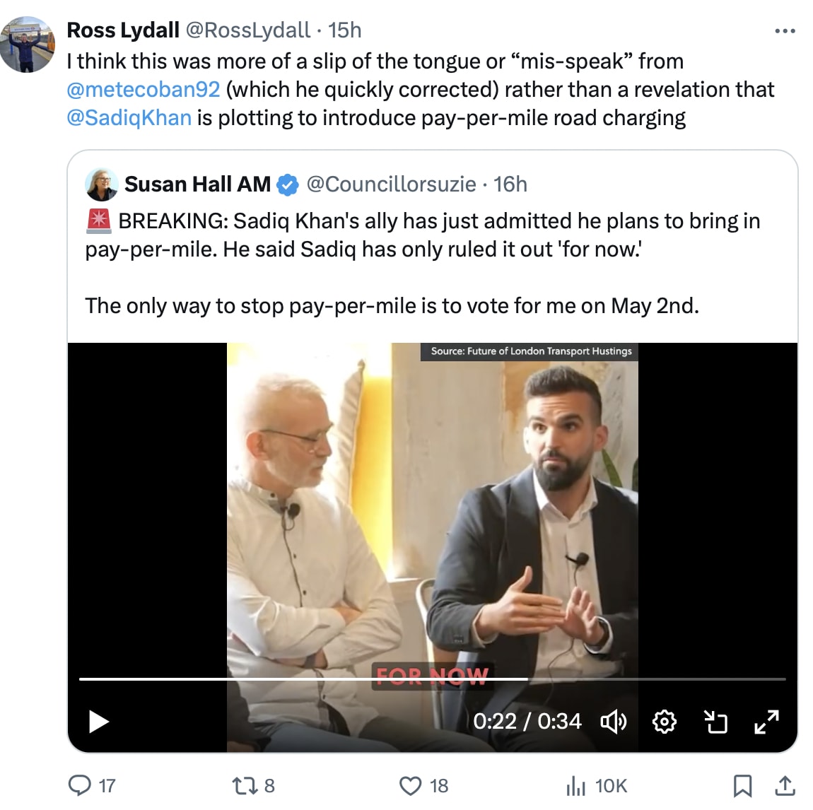 Notably, Lydall was quick to defend Coban when he cocked up yesterday and told attendees that Khan had only ruled out pay-per-mile “for now”.