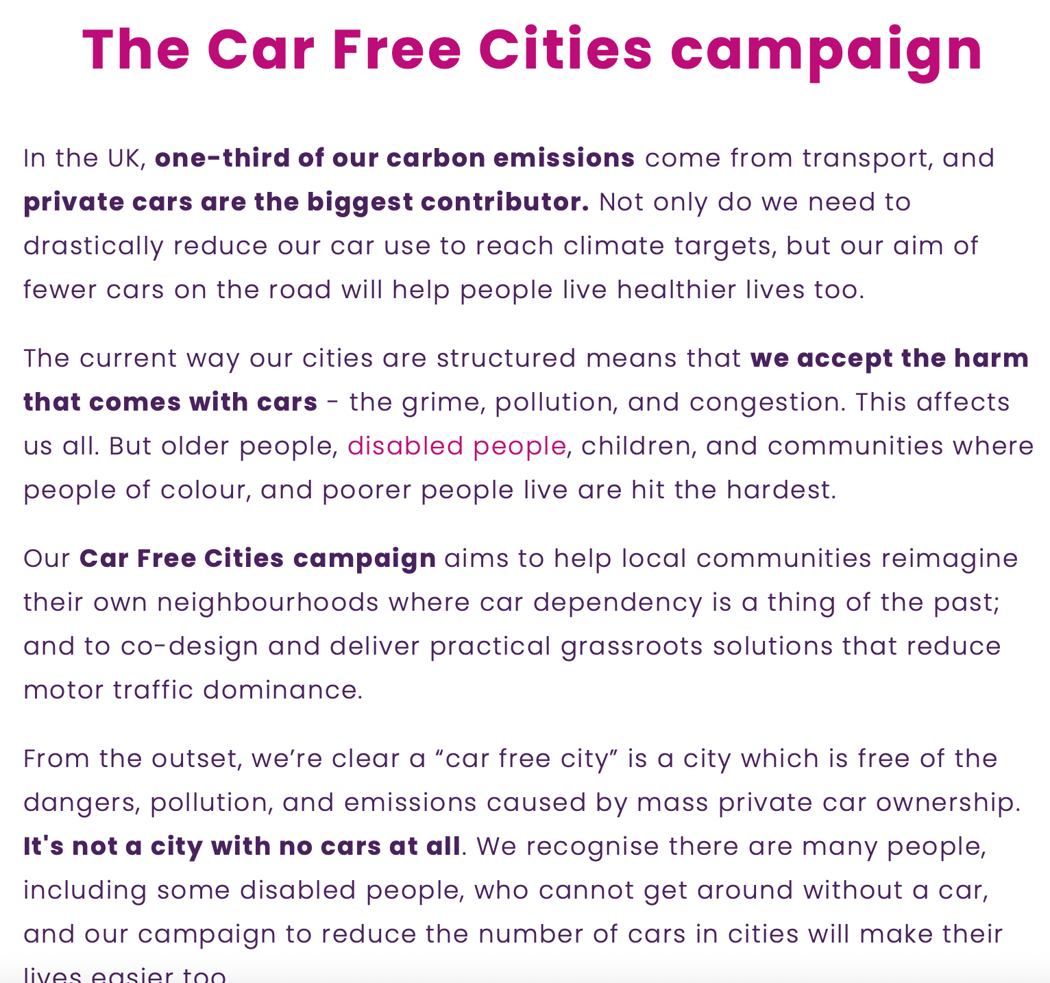 Then there’s Possible, a charity that also doesn’t like cars. Possible has a Car Free Cities campaign which “aims to help local communities reimagine their own neighbourhoods where car dependency is a thing of the past”: