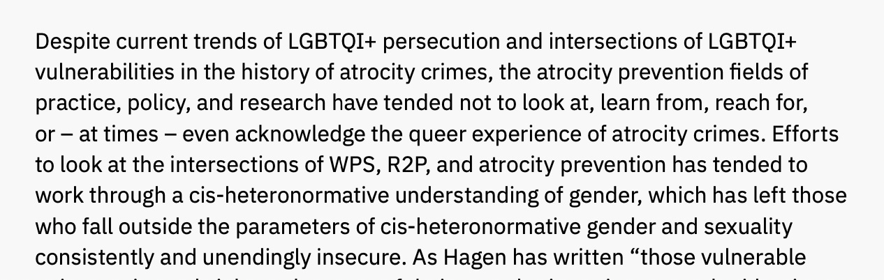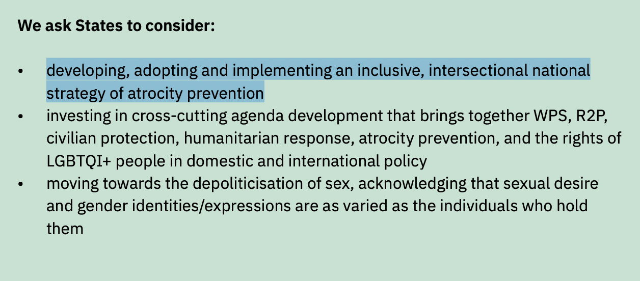 For instance, in its 2022 paper Queering atrocity prevention, it uses terminology such as âcis-heteronormativeâ, and recommends that States consider: âdeveloping, adopting and implementing an inclusive, intersectional national strategy of atrocity preventionâ.