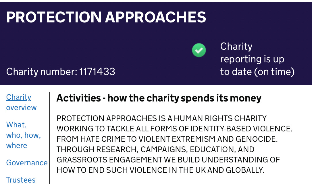 First is Protection Approaches, describing itself as âA HUMAN RIGHTS CHARITY WORKING TO TACKLE ALL FORMS OF IDENTITY-BASED VIOLENCEâ.