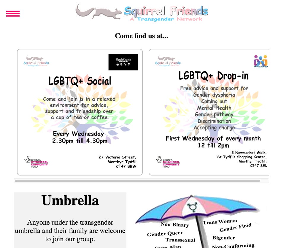 Squirrel Friends - A Transgender Network in Merthyr Tydfil is using a £19482 grant to provide a safe and welcoming space for members of the LGBTQ+ community providing drop in support services counselling a safe space and to get advice through a peer-to-peer network.