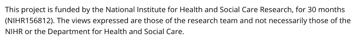 Well, the project is funded by the National Institute for Health and Social Care Research (funded by the Department of Health and Social Care). Researchers add: âThe views expressed are those of the research team and not necessarily those of the NIHR or the Department for Health and Social Care.â But it doesnât mean much when taxpayers are still paying for it.