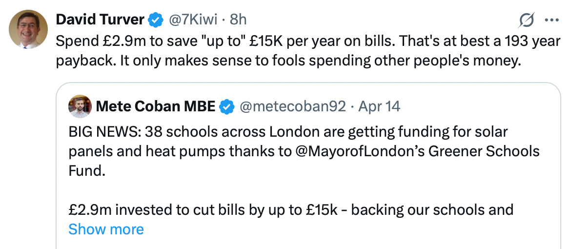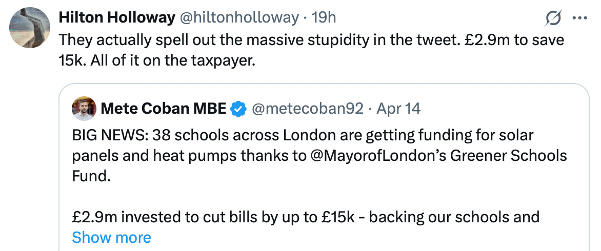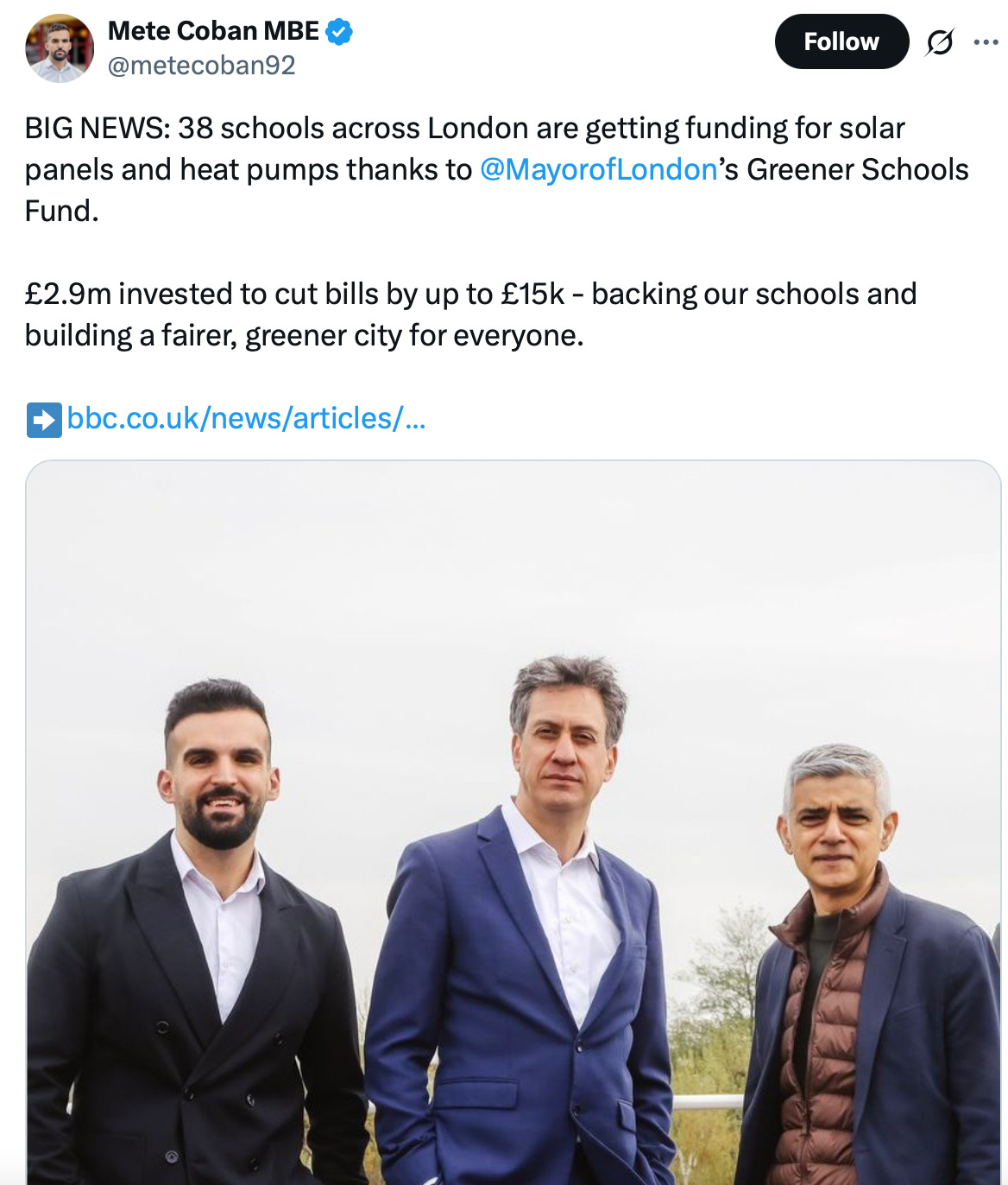 Yesterday, Sadiq Khan’s £148k-per-year Deputy Mayor of the Environment, Mete Coban, proudly posted that the Mayor of London had invested £2.9m “to cut bills by up to £15k - backing our schools and building a fairer, greener city for everyone.”