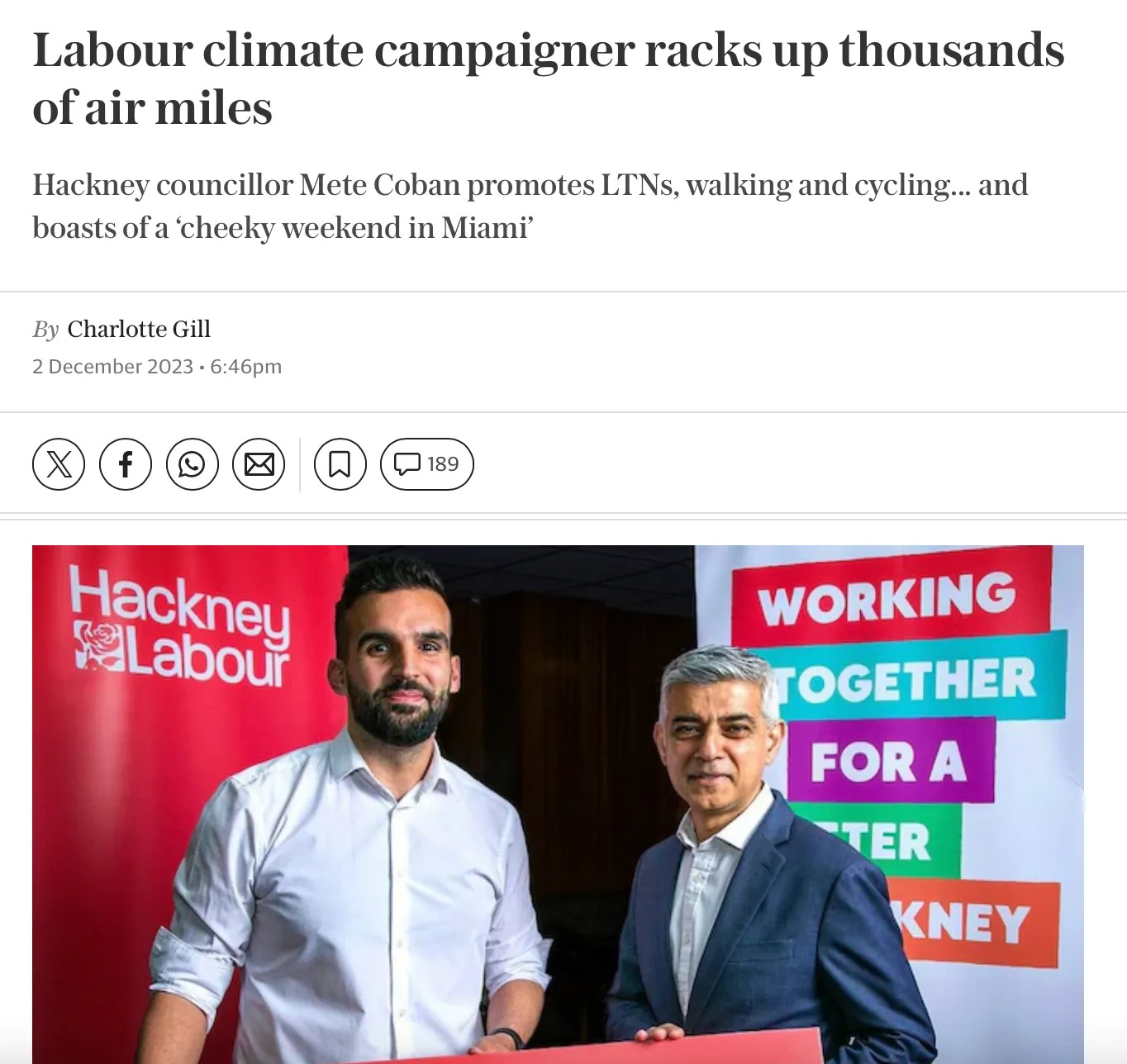Sadly Coban isn’t known for his cutting-edge logic. While Hackney’s Cabinet Member for the Environment he racked up 40,000 air miles…
