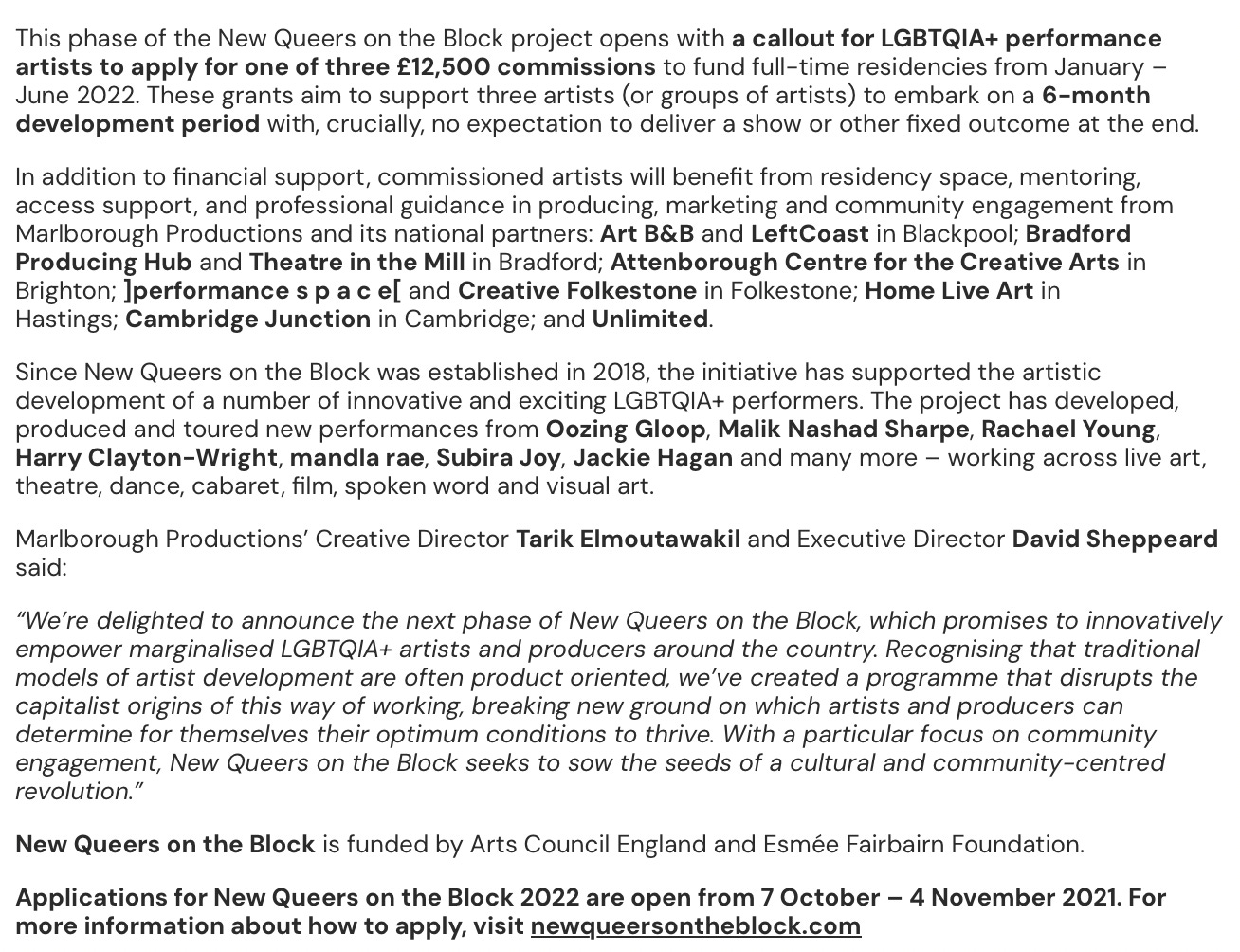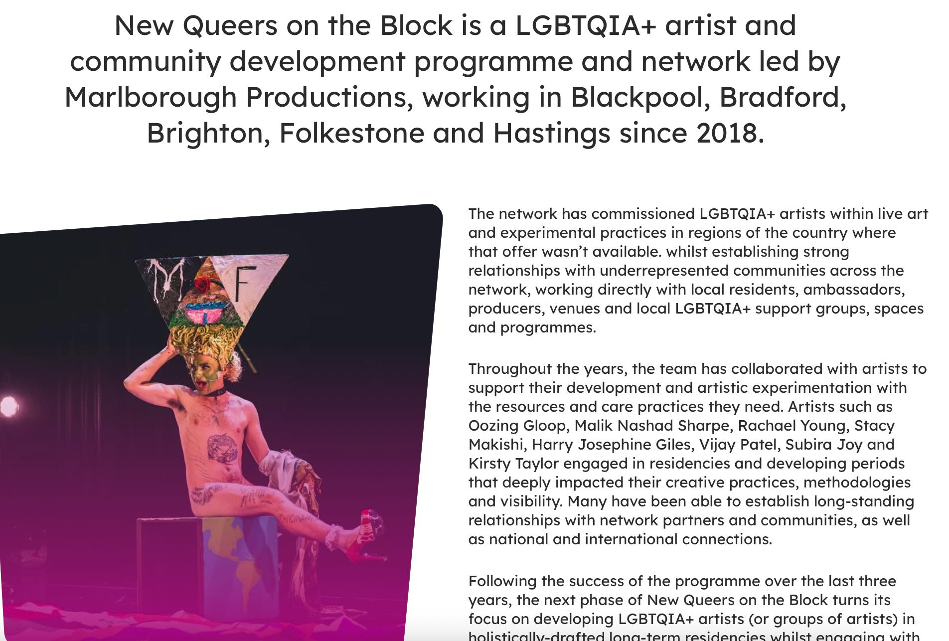 Since 2018, Marlborough Productions has offered individual grants worth ÂŁ12,500 for LGBTQ+ performance-makers. An advert for the scheme in 2022 reads: âThis phase of the New Queers on the Block project opens with a callout for LGBTQIA+ performance artists to apply for one of three ÂŁ12,500 commissions to fund full-time residencies from January â June 2022. These grants aim to support three artists (or groups of artists) to embark on a 6-month development period with, crucially, no expectation to deliver a show or other fixed outcome at the end.â