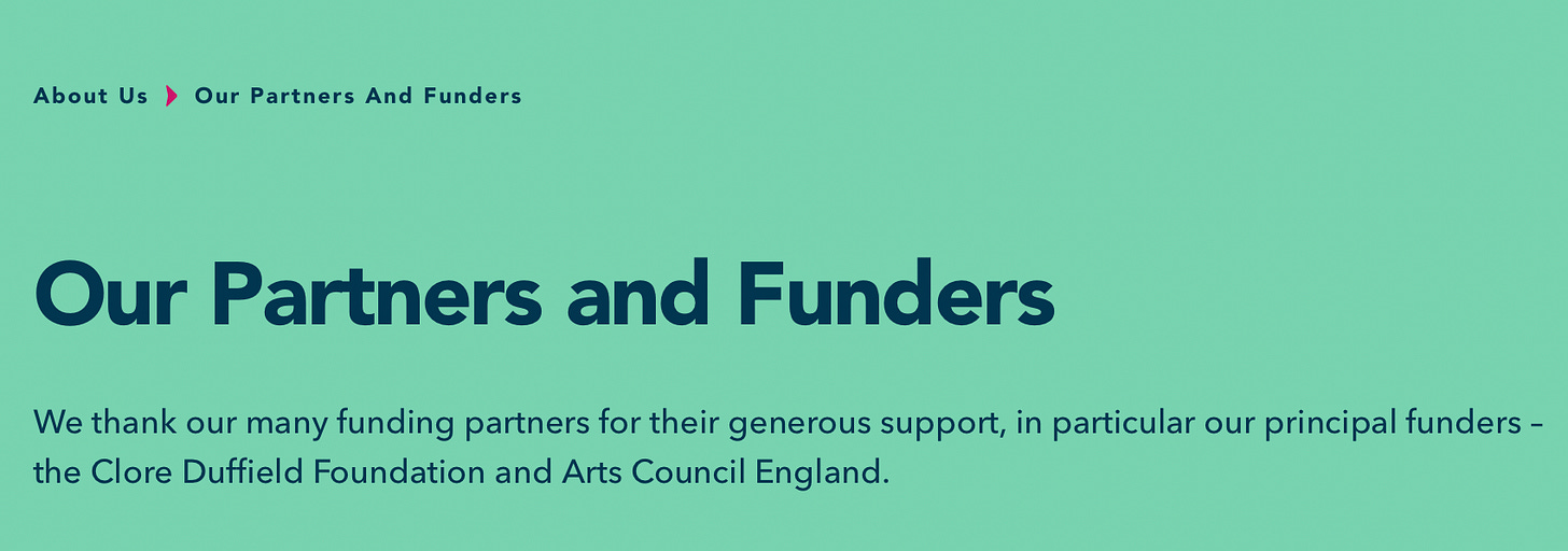 It turned out that one of Clore Leadershipâs principal funders is ACE. The accounts look as if two separate organisations funded Marlborough Theatre, but you could say itâs more like one (given that one partially funds the other).