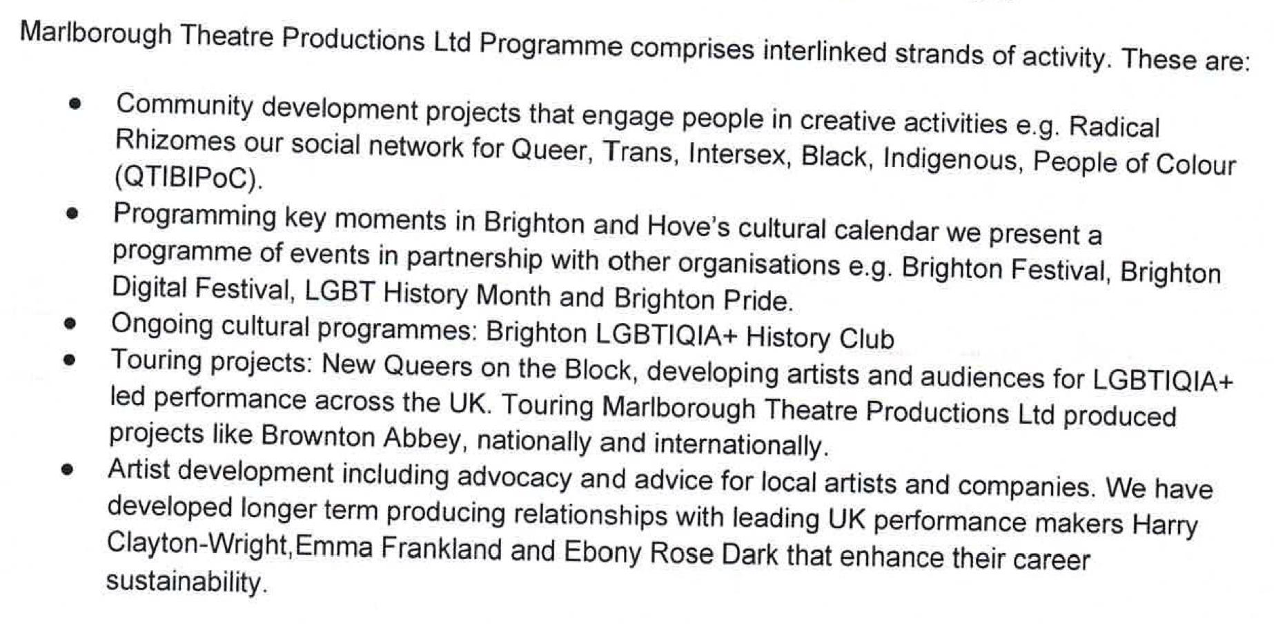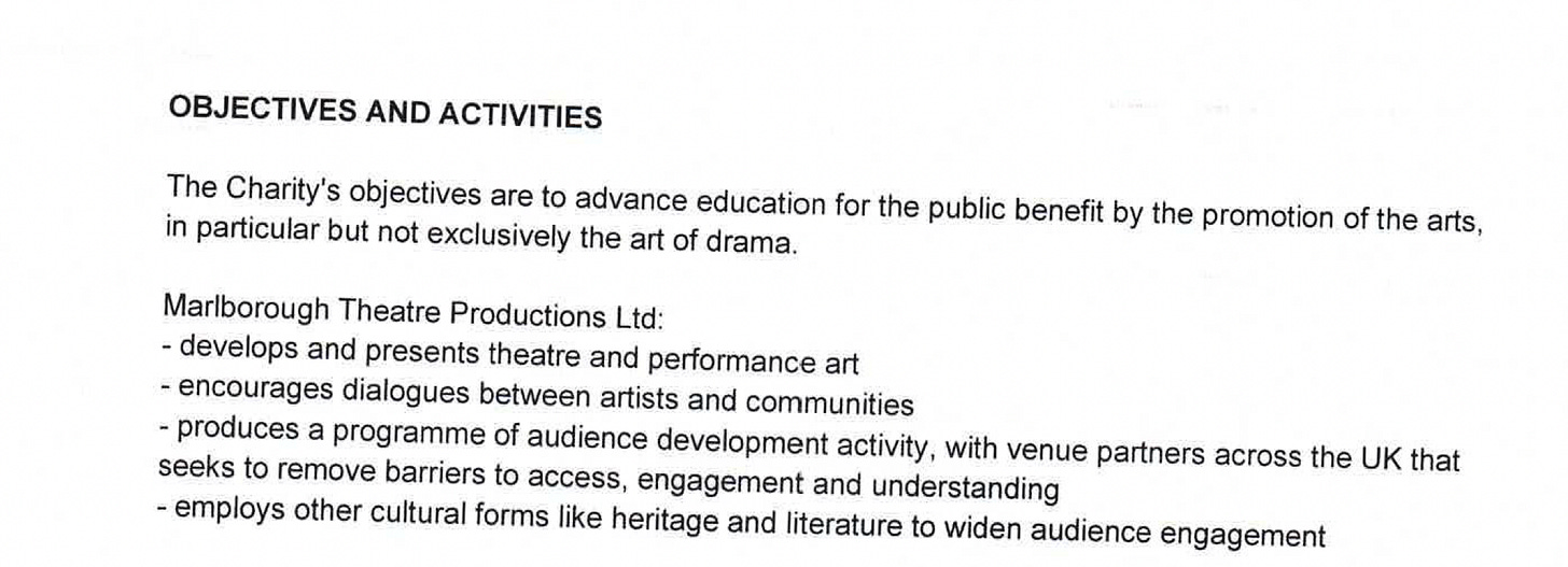 Marlborough Productionsâ accounting documents (for the year ended 31 March 2023) sound very reasonable; vanilla even. The company wants âto advance education for the public benefit by the promotion of the arts, in particular but not exclusively the art of drama.â