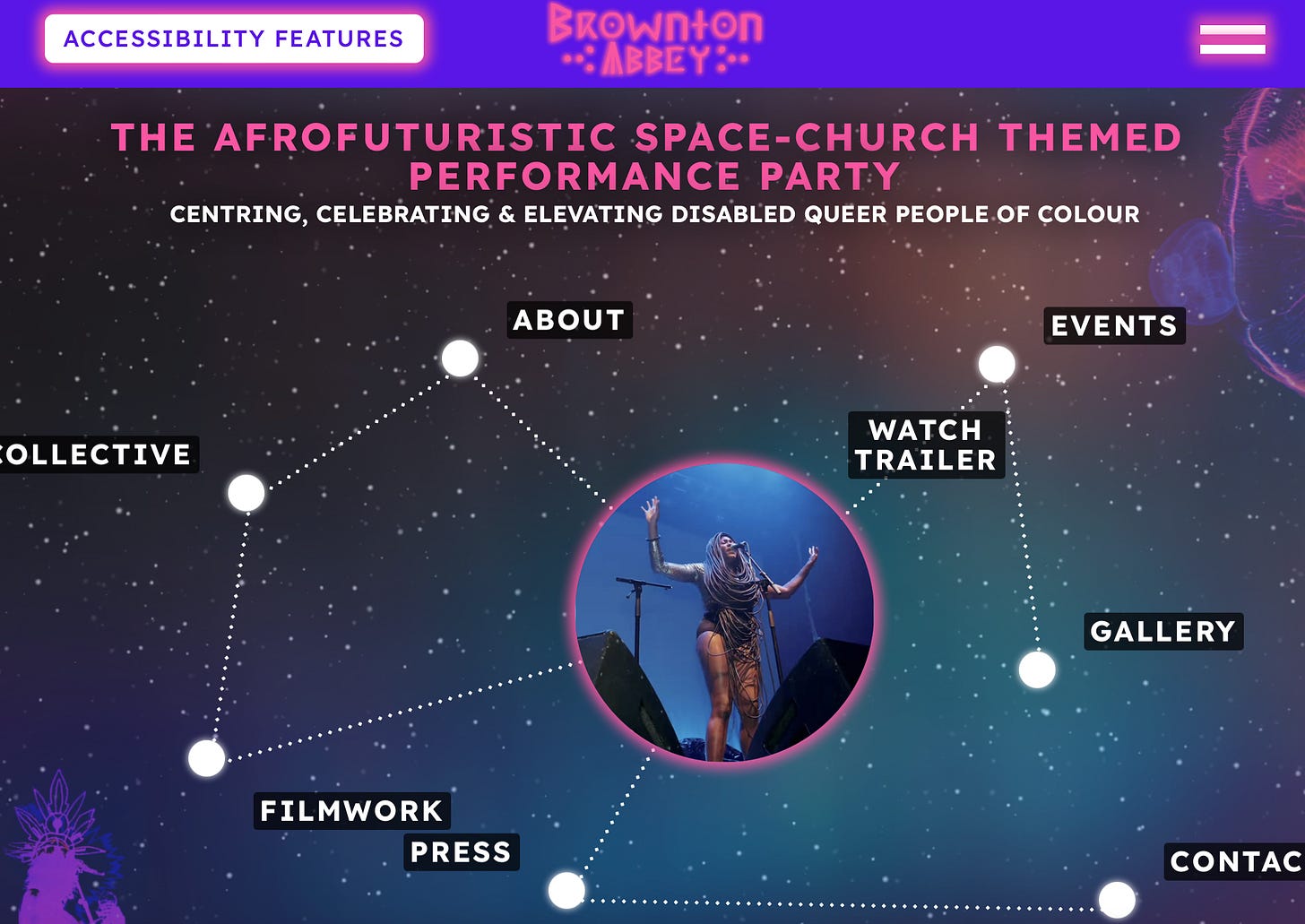 Elmoutawakilâs âcurrent public workâ is titled âBrownton Abbeyâ, an evolving Afro-Futures Performance Party that centres disabled QTIPOC (queer, trans and intersex People of Colour). Brownton Abbey reclaims and reinterprets QTIPOC spirituality and ritual, channelling it into an out-of-this-world, accessible party.â