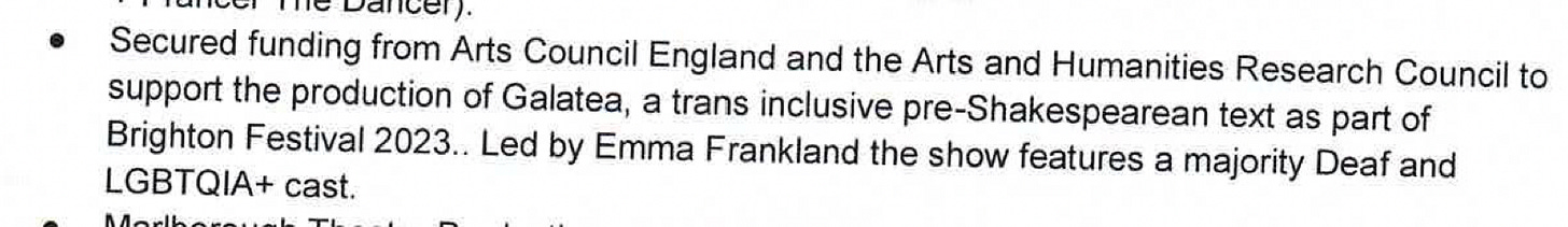 Marlboroughâs accounts also say the theatre âSecured funding from Arts Council England and the Arts Humanities Research Council to support the production of Galatea, a trans inclusive pre-Shakespearean textâ: