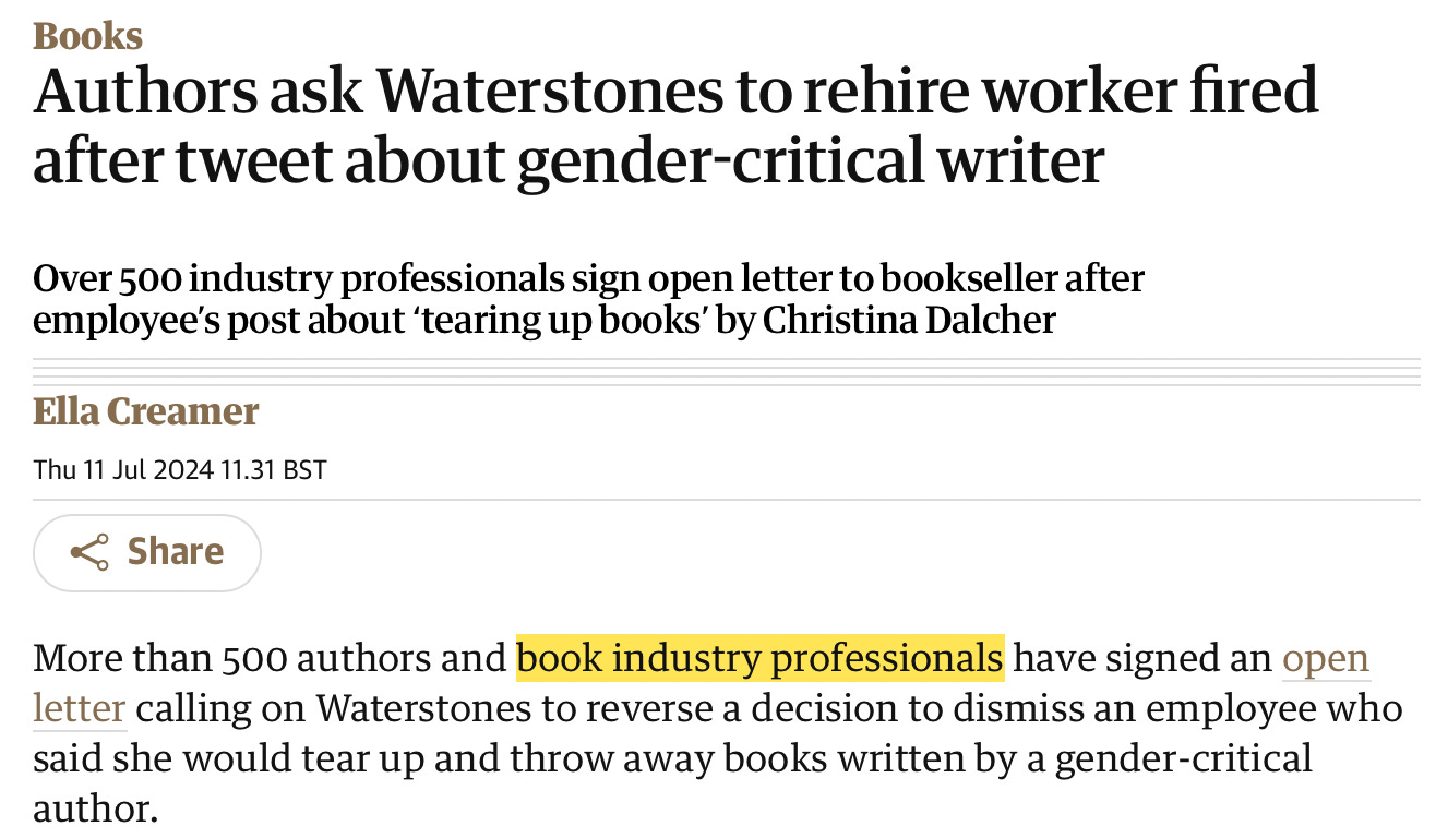 She rallied âauthors and book industry workersâ, getting them to sign an open letter in support of Tilly. Seeing this, and The Guardianâs write up - which mentioned that â500 authors and book industry professionalsâ were signatories - youâd get the impression of a serious commotion in the literary world. You might imagine that everyone from Jilly Cooper to Ian McEwan to Richard Osman was furious about Waterstonesâ decision.