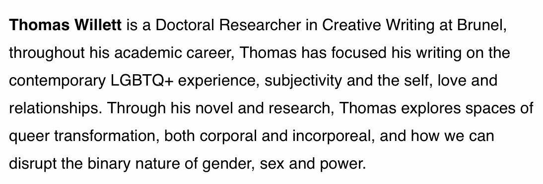 Willett is a Doctoral Researcher in Creative Writing at Brunel University, where he âexplores spaces of queer transformation, both corporal and incorporeal, and how we can disrupt the binary nature of gender, sex and power.â
