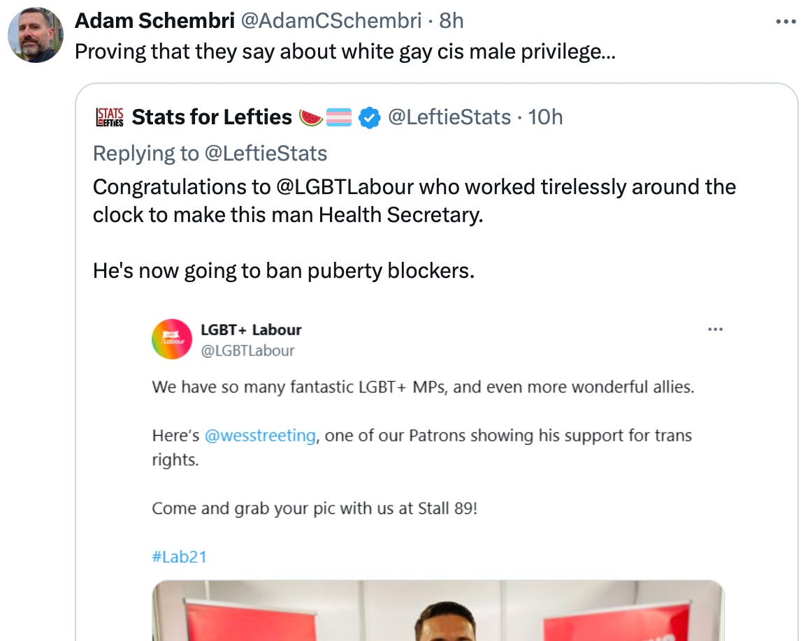 But up until recently itâs only had two members, one of which is a whiny man who sits on X getting annoyed at JK Rowling and fighting for children to have puberty blockers: