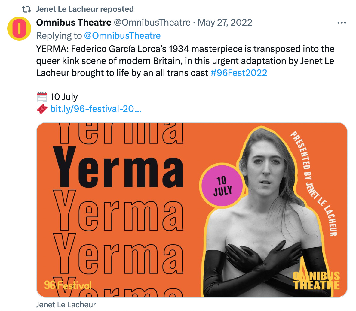 Jenet Le Lacheur, Author (whose talents extend to acting. Le Lacheur recently rewrote and starred in Yerma, âtransposed into the queer kink scene of modern Britainâ in an âurgent adaptationâ with an âall trans castâ):