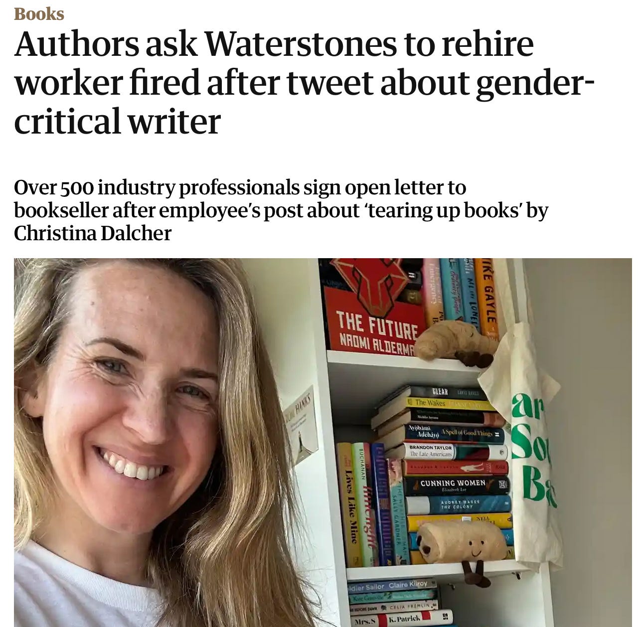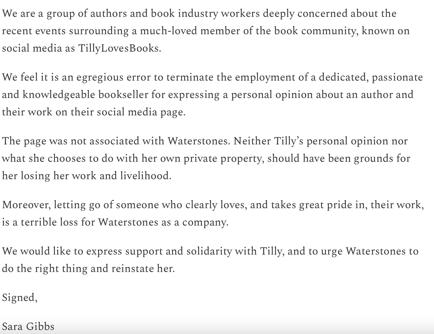 This week The Guardian broke the news that over â500 authors and book industry professionals have signed an open letter calling on Waterstones to reverse a decision to dismissâ Tilly Fitzgerald, a bookseller.