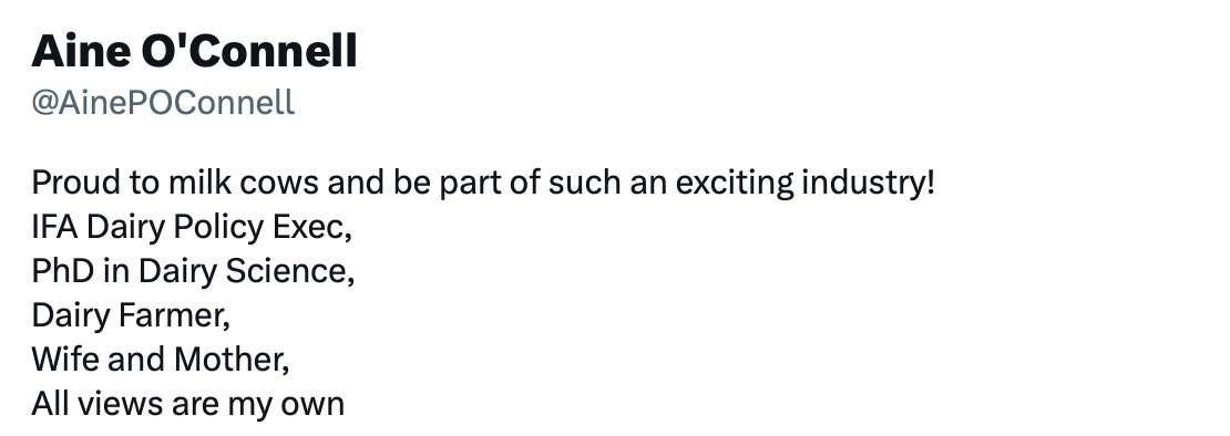 Then I searched for another blogger on the list called Aine O'Connell. I could only find a woman whose Twitter profile says sheâs âProud to milk cowsâ