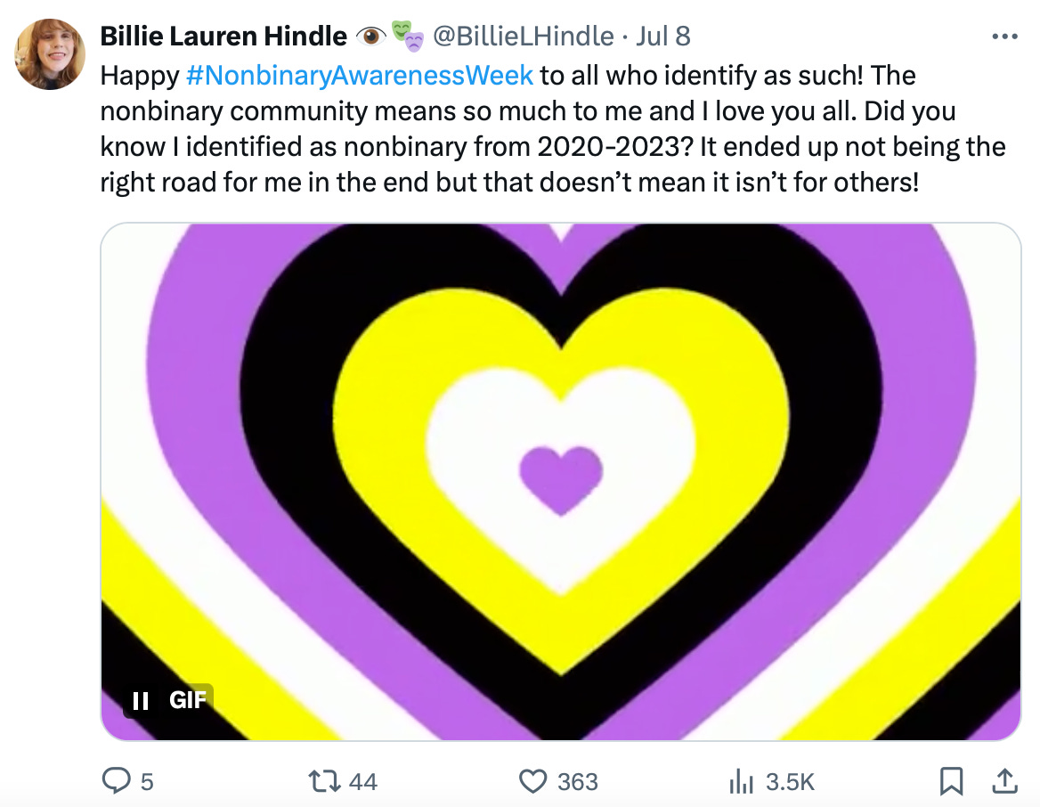 âDid you know I identified as nonbinary from 2020-2023? It ended up not being the right road for me in the end but that doesnât mean it isnât for others!â