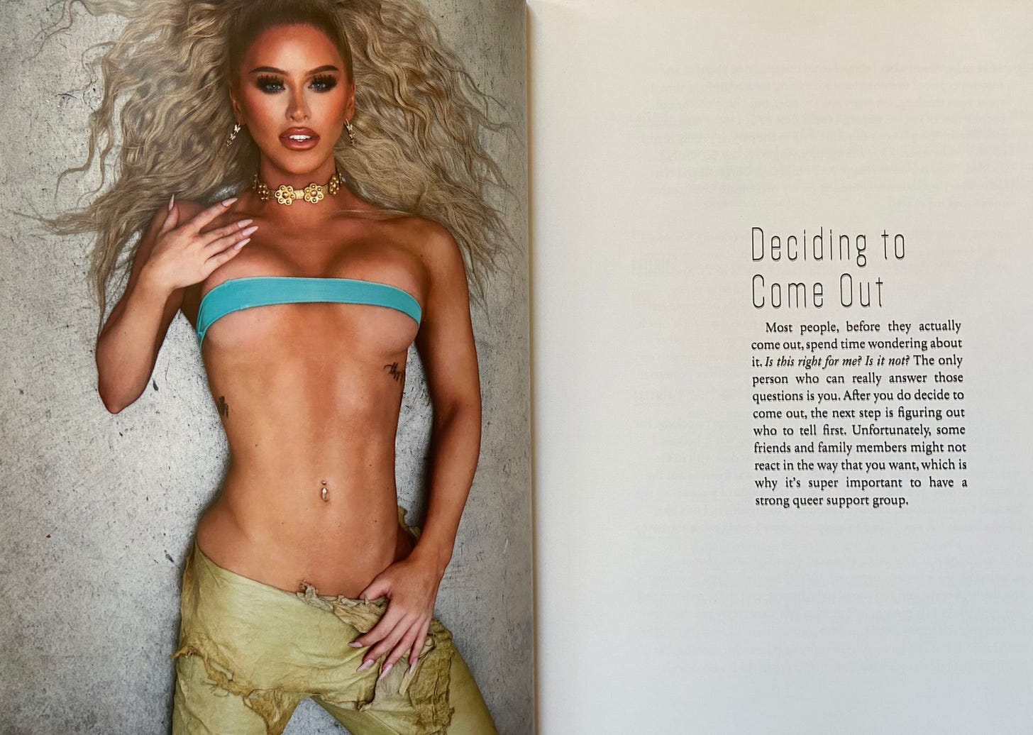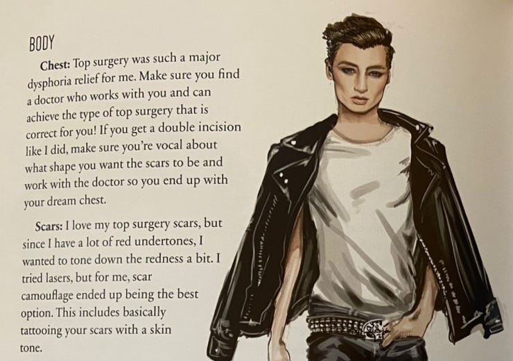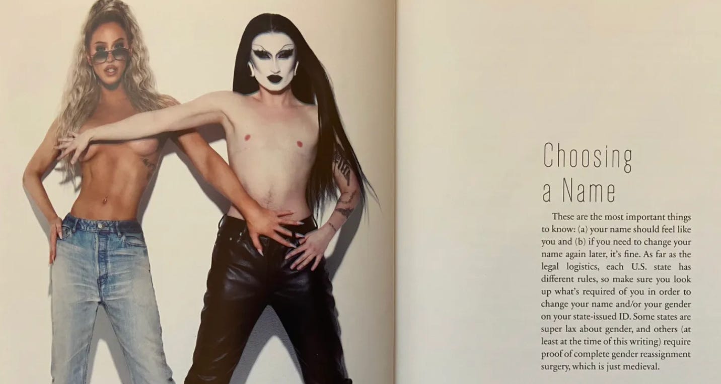 Gottmik, while wearing creepy white face paint, advises readers on how to come out as their “authentic self”, and Gigi Gorgeous - in the tone of a parent telling their child they’re going to Disneyland - writes: “We’re going to tell you who are favourite surgeons are at the end of the book! Flip back there now if you can’t wait to find out.”