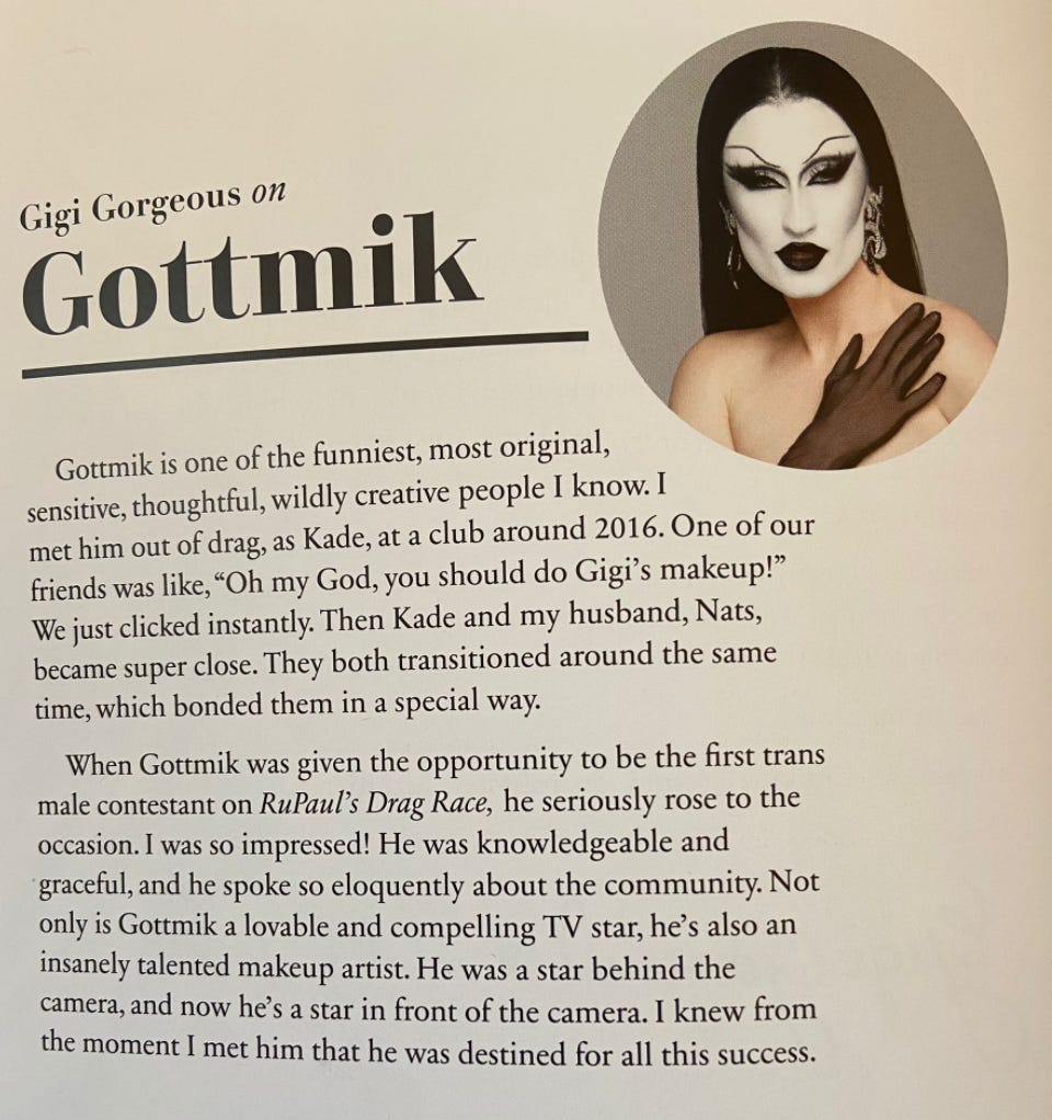 I could go on about this book - for instance, RuPaul’s Drag Race doesn’t come out of it very well, and it’s striking that Gigi Gorgeous (and another transgender individual in the book) went to Catholic school while Gottmik came from a Christian family - but you get the gist.