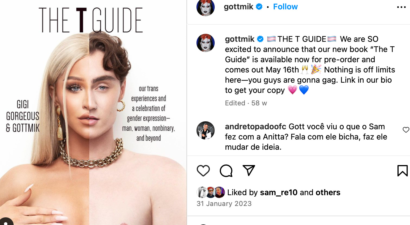Its authors are Gigi Gorgeous and Gottmik”, two “transgender icons”, according to WH Smith, Waterstones, GoodReads and every other seller which has copied and pasted the synopsis onto their website.