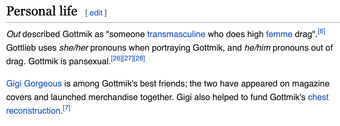 Wikipedia casts a more confusing light as it turns out Gottmik is actually a drag character (woman), played by Kade Gottlieb (a trans man).