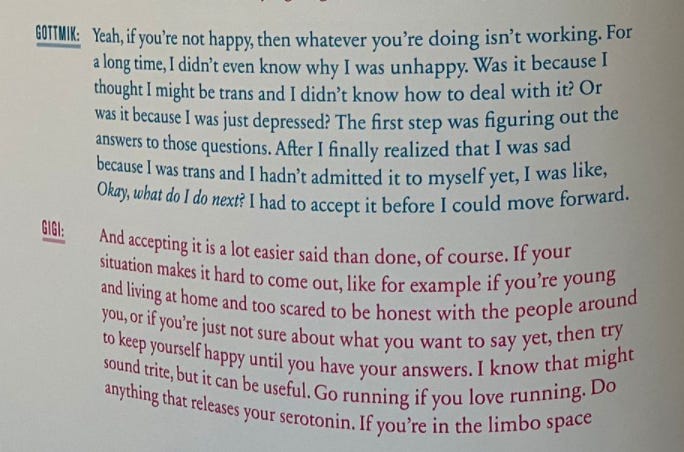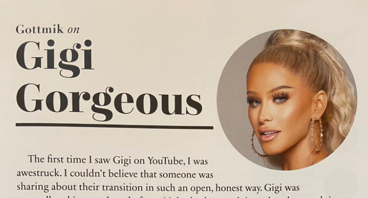 Because Gigi Gorgeous is a woman and Gottmik a man, the forward-thinking editors behind The T Guide even put their quotes in pink and blue, respectively: