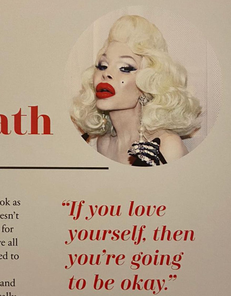 It even has this quote below by Amanda Lepore, who doesn’t seem to be taking her own advice that “If you love yourself, then you’re going to be okay”.