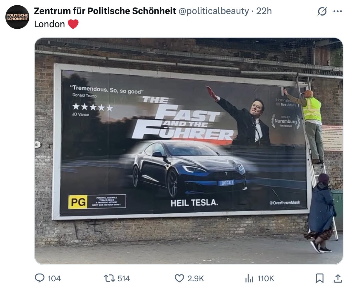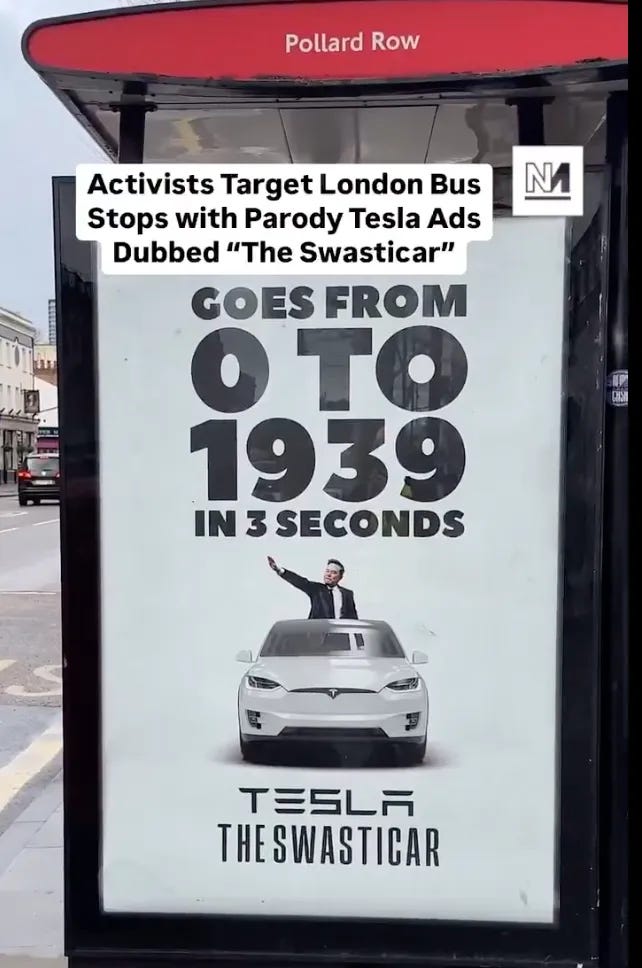 Yesterday a group of activists from the group “Overthrow Musk” put up the poster (above) in Tottenham, down the road from Tesla’s showroom.