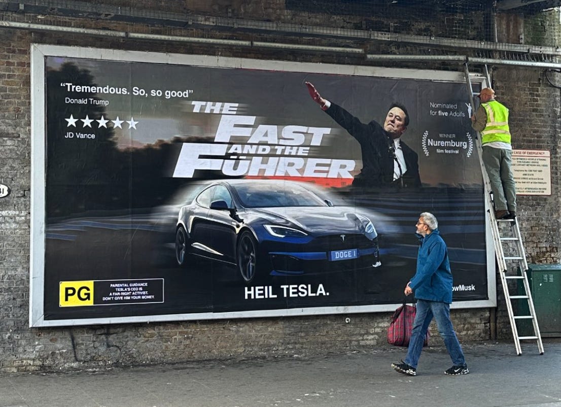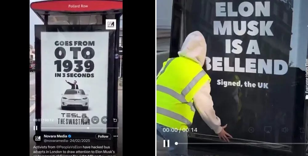 It follows two posters being put up in the weeks preceding, first by a group called “People vs Musk”, and next by a group titled “Everyone Hates Elon”, captured by Novara Media and Politics Joe, respectively (more on this later).