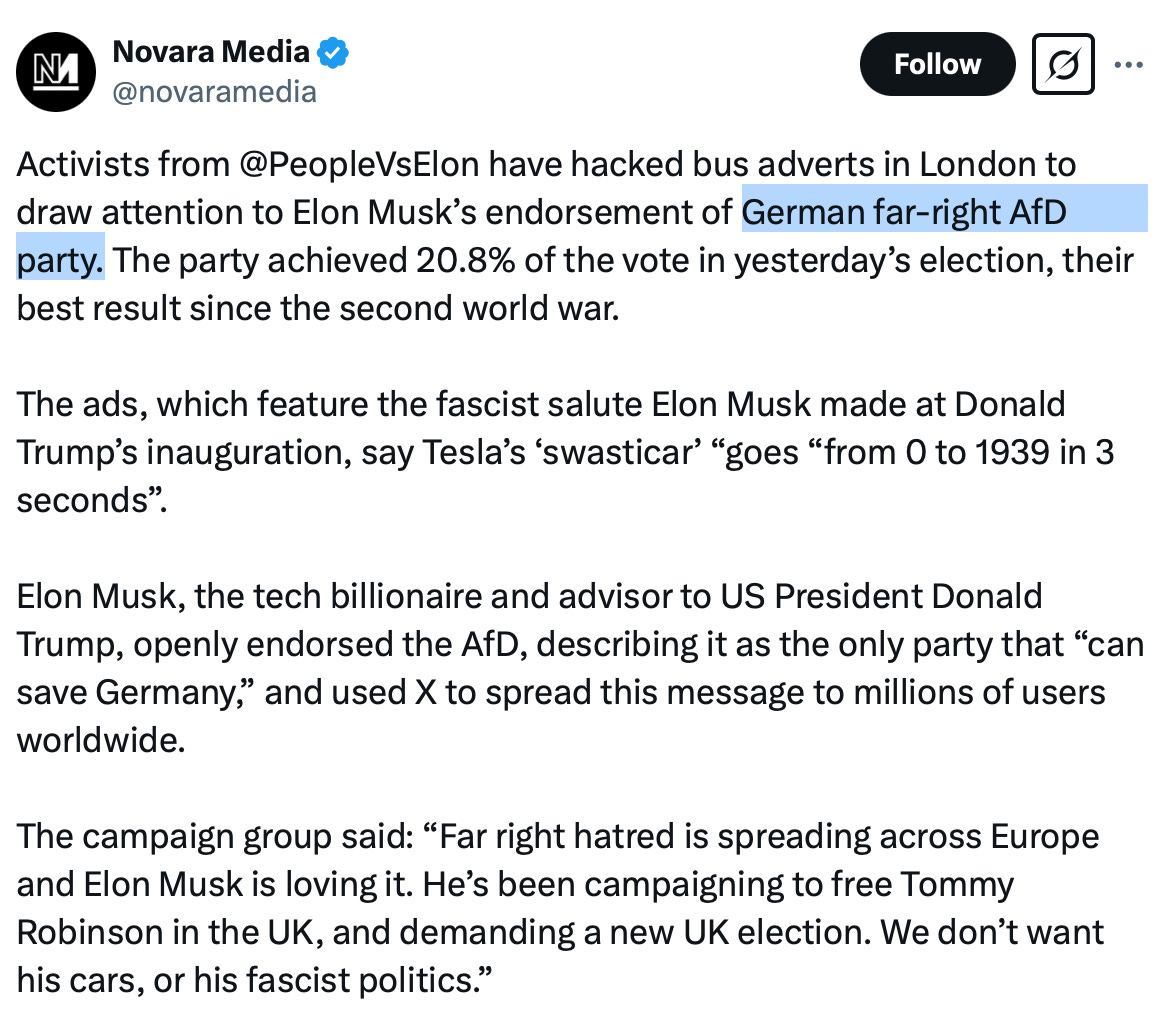 Novara Media, which - to reiterate - was amazingly able to capture the activists as they put up their posters, singled out the AfD in its post about “PeopleVsElon” - again hinting that the protests have German origins: