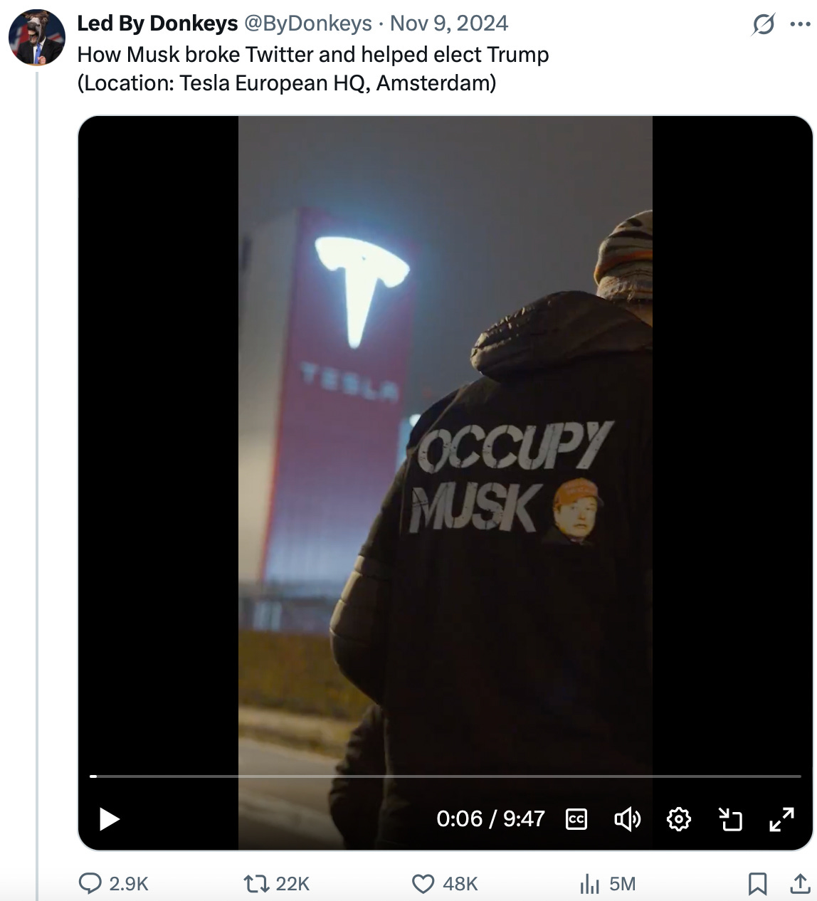 In November last year, Led by Donkeys staged an anti-Musk display at Tesla European HQ, Amsterdam, helped by an activist wearing an “Occupy Musk” t-shirt (could this relate at all to “Occupy Wall Street”?)
