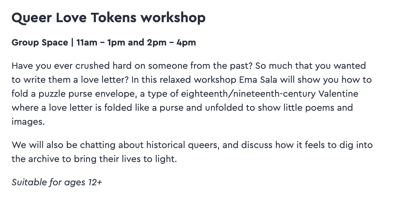 A Queer Love Tokens workshop including a chat “about historical queers”.